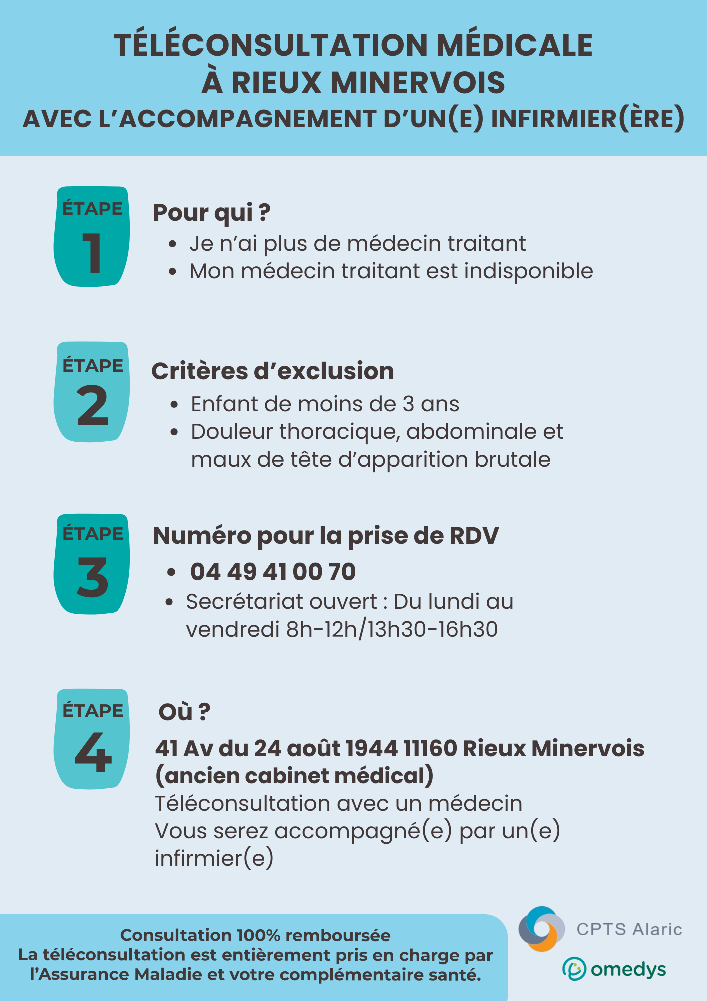 Dans un contexte de difficultés d’accès aux soins et de pénurie de médecins traitants, nous souhaitons vous informer que la CPTS Alaric a mis en place une solution de téléconsultation assistée et augmentée destinée aux habitants du territoire de la CPTS Alaric ne disposant pas de médecin traitant.